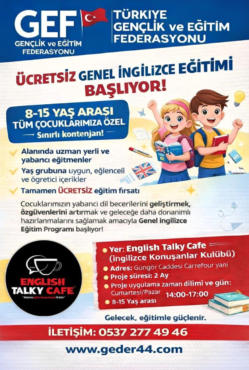 Türkiye Gençlik ve Eğitim Federasyonu, 8–15 yaş arası çocuklara yönelik tamamen ücretsiz Genel İngilizce Eğitim Programı başlattı. Eğitim programı, çocukların erken yaşta İngilizceyle tanışmasını ve temel dil becerilerini geliştirmesini amaçlıyor.