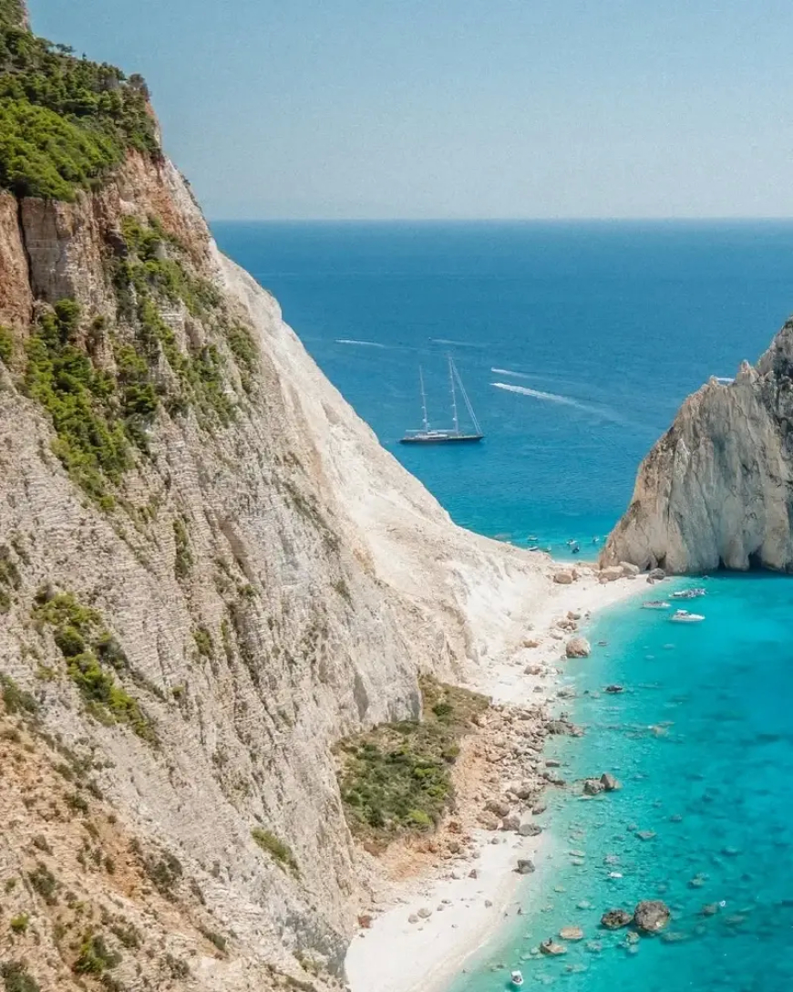 Zakynthos’un simgesi haline gelen Navagio Plajı, yüksek kayalıkların arasında gizlenmiş beyaz kumları ve berrak turkuaz sularıyla ziyaretçilerini büyülüyor. Hava fotoğraflarında sıkça karşımıza çıkan bu plaj, özellikle doğa ve fotoğraf tutkunlarının uğrak noktası.